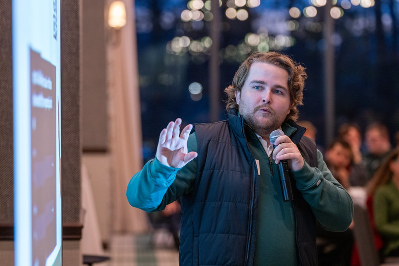 As is our tradition, we had a student speaker open the evening with a short technical lecture. Joey Larabee, current MS student in Data Science (as well as Graduate Certificate in Sports Analytics) delivered remarks on his latest work on the implied Pythagorean exponent in professional hockey. As with John’s talk later in the evening, Joey’s presentation invited many follow-up questions from the audience. And just like John, Joey answered these questions with kindness and interest in the folks asking them.